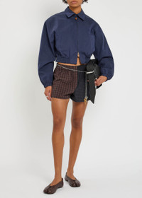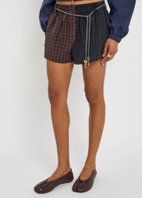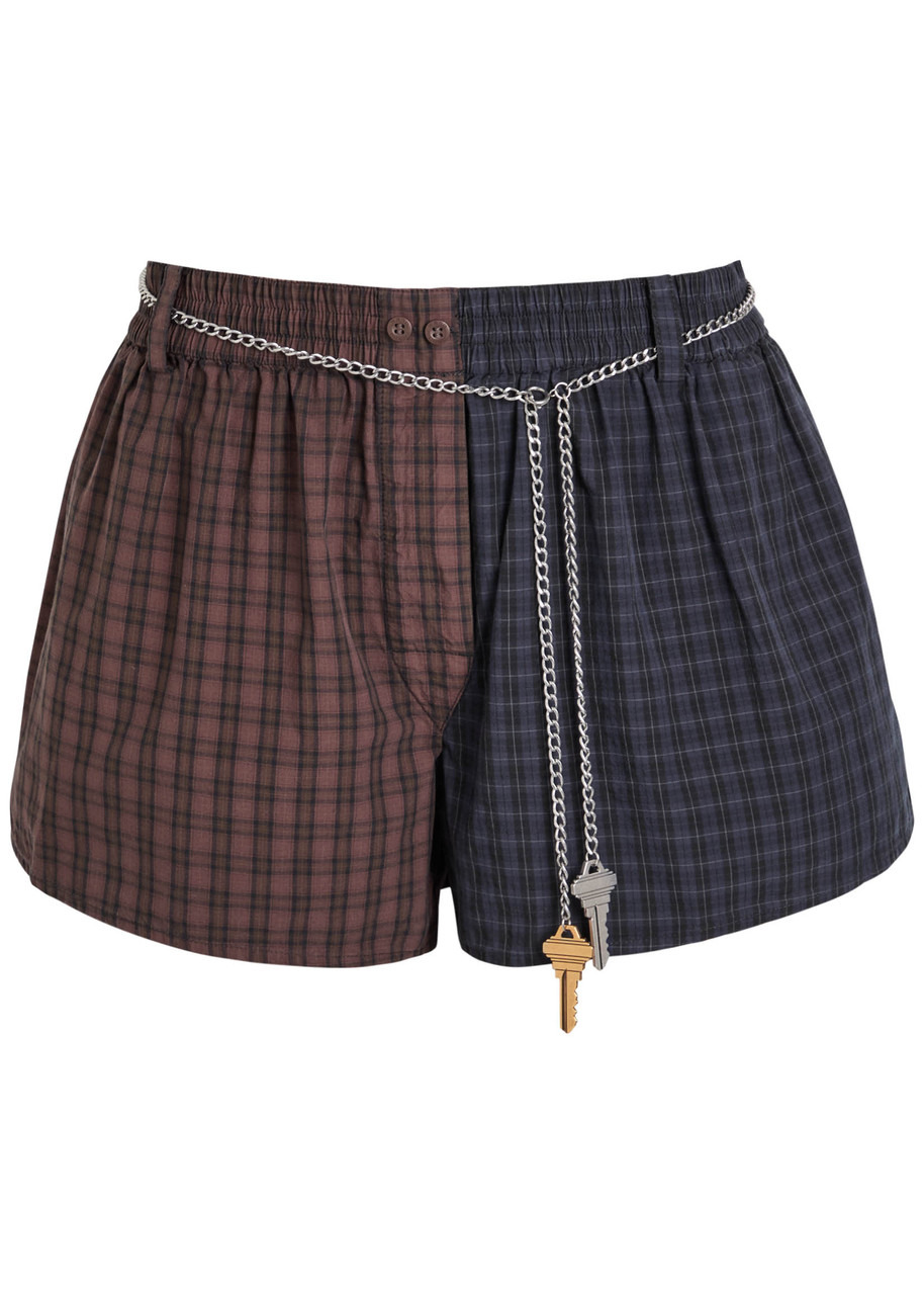 Info & Care Alenxander Wang cotton shorts; Checked,;faux button-fastening;elasticated waistband, belt loops, detachable chain belt with key charms, faux fly, side slip pockets, logo embroidery at side, side splits, longer back hem Pull on 100% cotton Machine wash Size & Fit Length waist to hem: 12 inches/ 30.5cm; 13.5 inches/ 34.5cm Midweight Boxy, relaxed fit Model is 5'9"/ 175cm and wears a size;US4