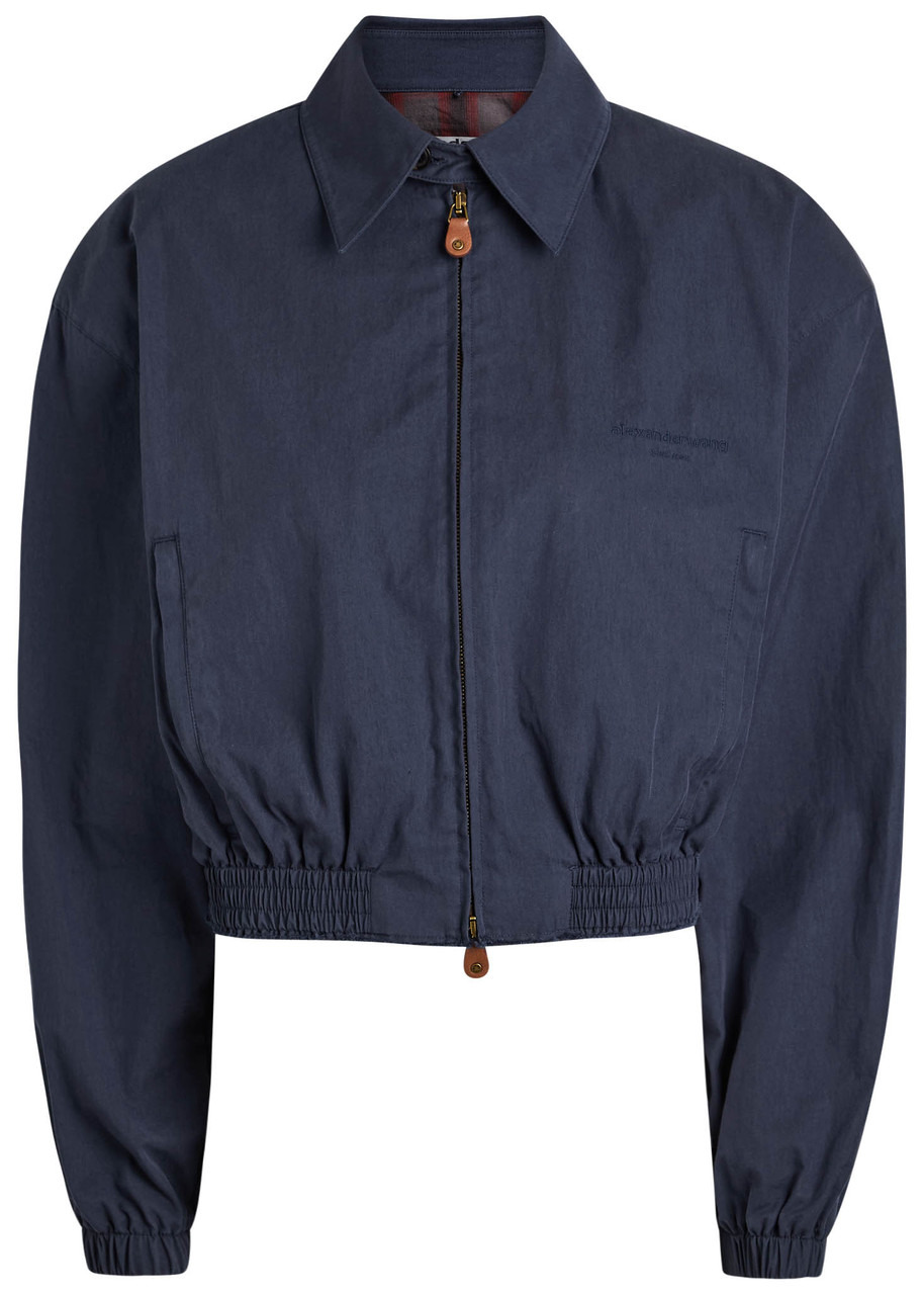 Info & Care Alexander Wang cotton-blend jacket Button-fastening collar, lightly padded dropped shoulders, rounded sleeves, elasticated cuffs, logo embroidery at chest, zip-fastening side slip pockets, elasticated balloon hem, fully lined Two-way zip fastening through front 74% cotton, 26% polyamide; lining: 100% cotton Hand wash Size & Fit Length shoulder to hem: 19 inches/ 48.5cm Midweight Boxy fit, cropped Model is 5'9"/ 175cm and wears a size small