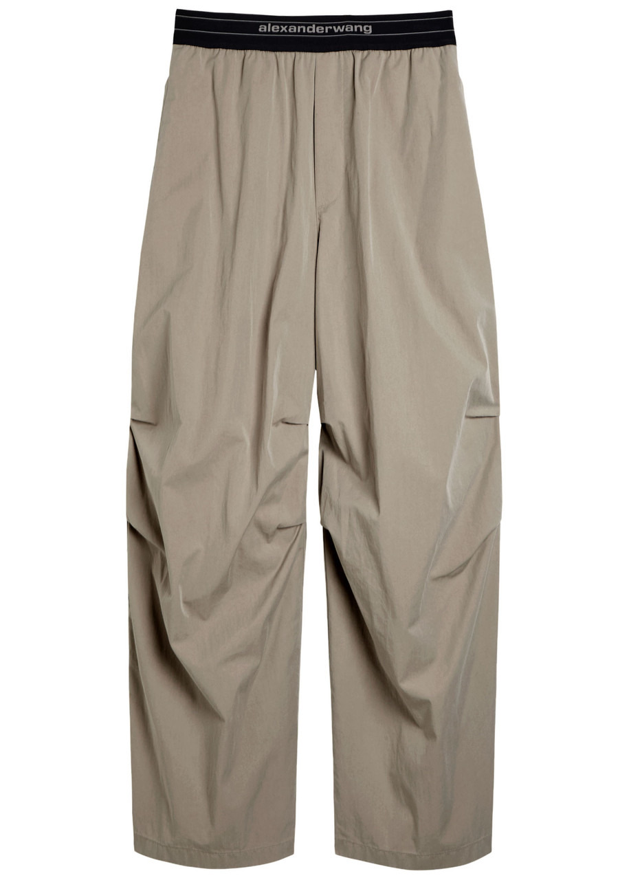 Info & Care Alexander Wang cotton-blend trousers Logo-jacquard elasticated waistband, faux fly, zip-fastening side pockets, gathering at inside leg Pull on 74% cotton, 26% nylon Machine wash Size & Fit Inside leg length: 30 inches/ 76cm Midweight Wide-leg cut Model is 5'9"/ 175cm and wears a size small