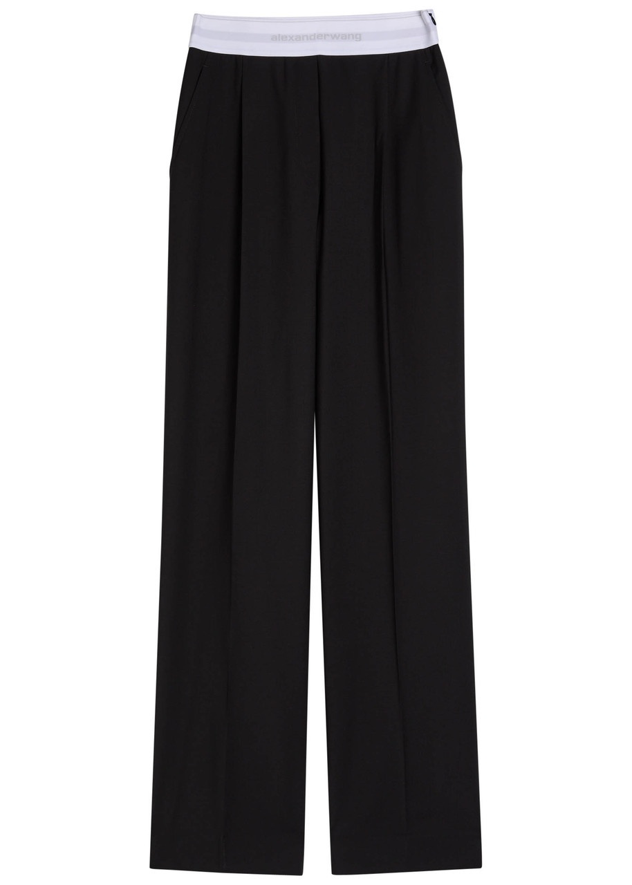 Info & Care Alexander Wang wool-blend trousers Logo-jacquard elasticated waistband, pleats at front, side slip pockets, pressed creases through legs, two slit pockets at back Concealed zip fastening at side 86% wool, 9% polyamide, 5% elastane; lining: 100% polyester; elastic: 71% polyamide, 19% polyester, 10% elastane Dry clean; Size & Fit Inside leg length: 33 inches/ 83.5cm Midweight Straight-leg cut Designed to sit high on the waist Model is 5'9"/ 175cm and wears a size;US4