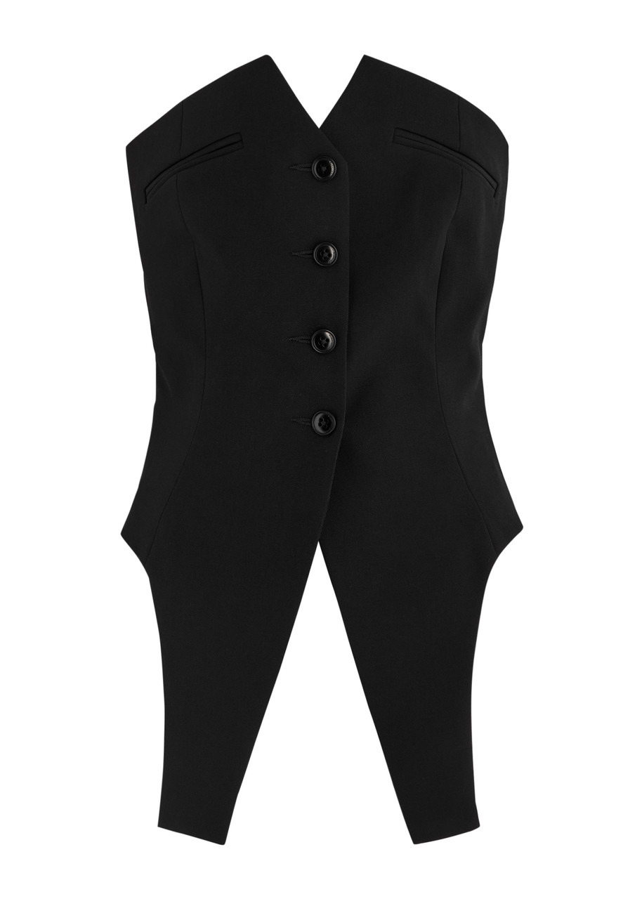 Info & Care alexanderwang.t wool waistcoat Strapless, side splits at;bust, boned bodice, two faux chest slit pockets, darted, adjustable-fastening strap at back, longer front;split hem, fully lined Button fastenings at front 100% wool; lining: 100% viscose Dry clean Size & Fit Length shoulder to hem: 21.5 inches/ 54.5cm; 2: 12 inches/ 30.5cm Midweight Regular fit Model is 5'9"/ 175cm and wears a size;US4