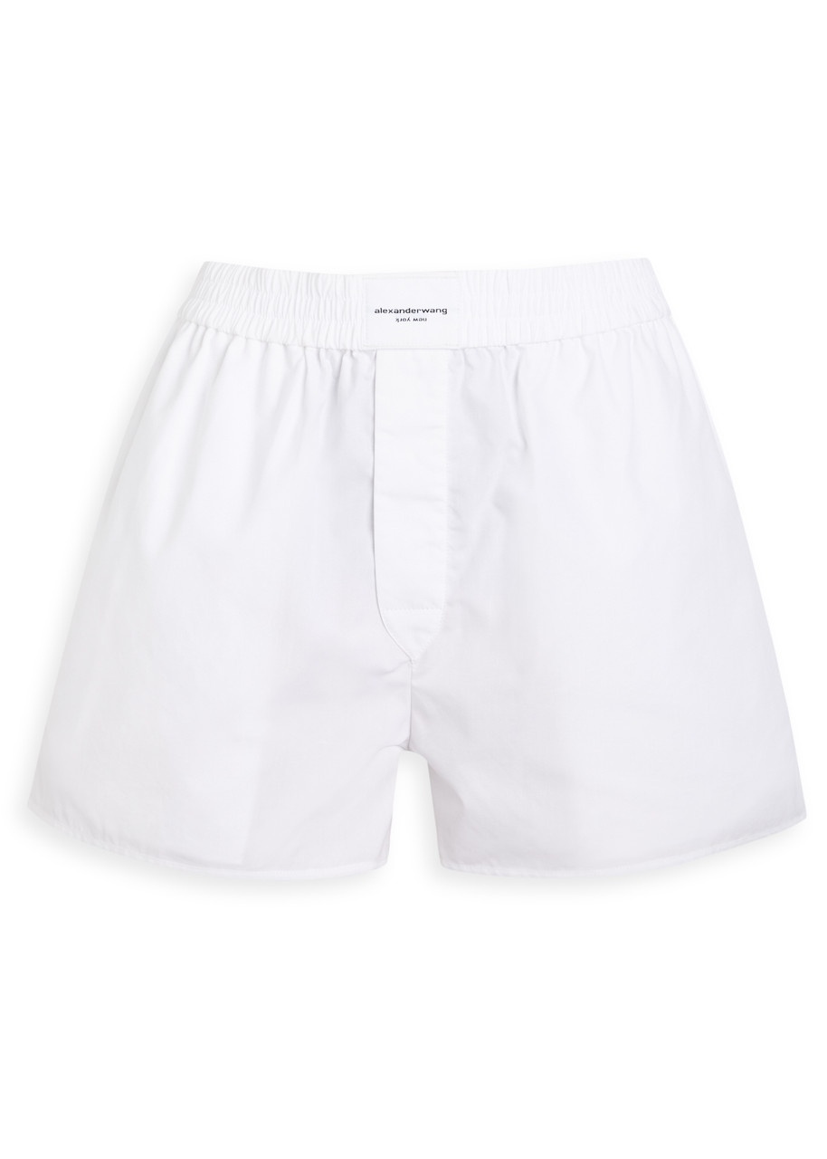 Info & Care alexanderwang.t shorts cotton-poplin shorts; Designer plaque at elasticated waistband, faux fly, side slip pockets Pull on 100% cotton Dry clean; Size & Fit Length waist to hem: 13.5 inches/ 34cm Midweight Regular fit Model is 5'9"/ 175cm and wears a size small
