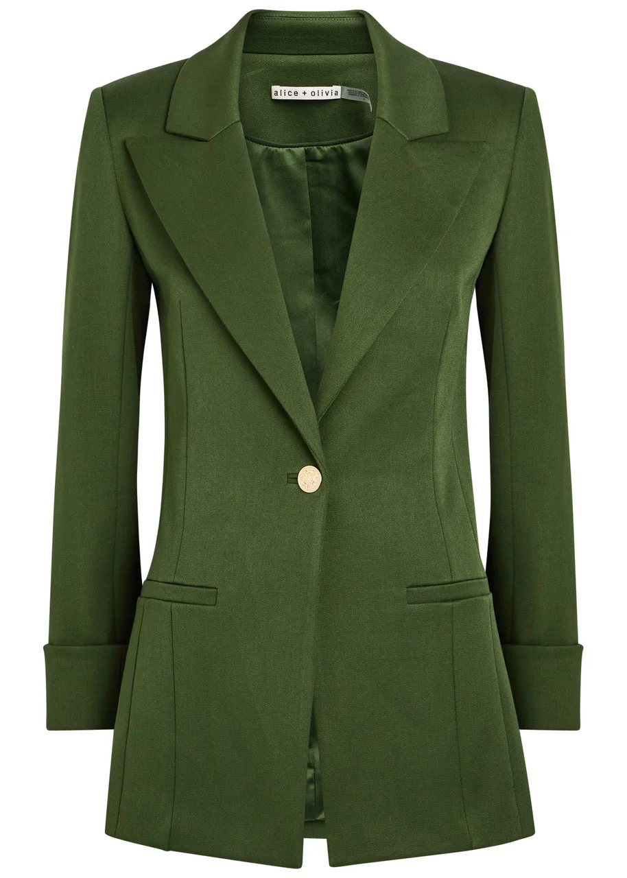 Info & Care alice + olivia woven;blazer Peaked;lapels, padded shoulders,;turn-up cuffs, darts through waist, front slit pockets, internal;slip pocket, fully lined; Button fastening at front 64% polyester, 32% viscose, 4% elastane; lining: 100% recycled polyester Dry clean Coordinating items available Size & Fit Length shoulder to hem: 29 inches/ 73.5cm Midweight Slim fit, fitted at waist Model is 5'10"/ 178cm and wears a size;US4
