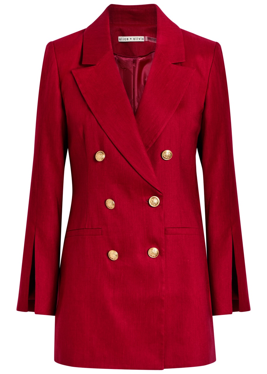 Info & Care Alice + Olivia linen-blend blazer Notched lapels, padded shoulders, split cuffs, two slit pockets at front, back vent, two internal button-fastening pockets, internal slip pocket, fully lined; Double-breasted button fastenings through front; 56% linen, 43% viscose, 1% elastane; lining: 100% polyester; Dry clean; Size & Fit Length shoulder to hem: 30 inches/ 76cm Midweight Regular fit Model is 5'9"/ 175cm and wears a size;US4