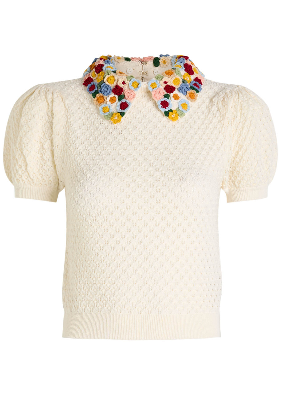 Info & Care Alice + Olivia open-knit top Detachable floral-embroidered collar, padded shoulders, puff sleeves, ribbed trims; Hook and zip fastening;at back 50% cotton, 50% wool; fabric 2: 60% cotton, 40% acrylic; fabric 3: 100% polyester Dry clean Size & Fit Length shoulder to hem: 19 inches/ 48cm Midweight Slim, cropped fit Model is 5'10"/ 178cm and wears a size;small