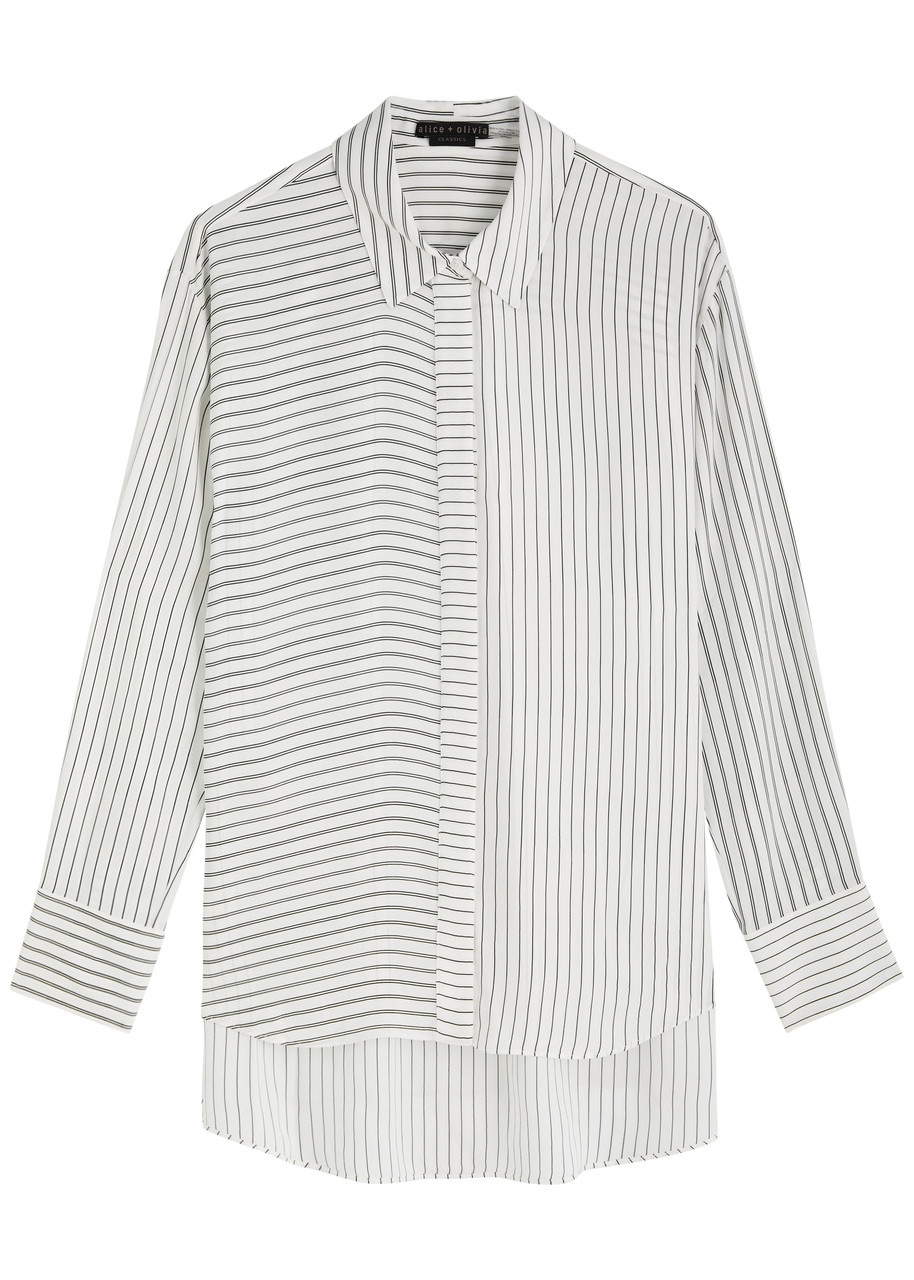 Info & Care Alice + Olivia satin shirt Striped, button-fastening cuffs, side splits at curved hem, box pleat at back, longer back hem Button fastenings through front; 100% viscose Dry clean Size & Fit Length shoulder to hem: front: 25 inches/ 63.5cm; back: 30 inches/ 76cm Midweight Slightly relaxed fit Model is 5'10"/ 178cm and wears a size;US4