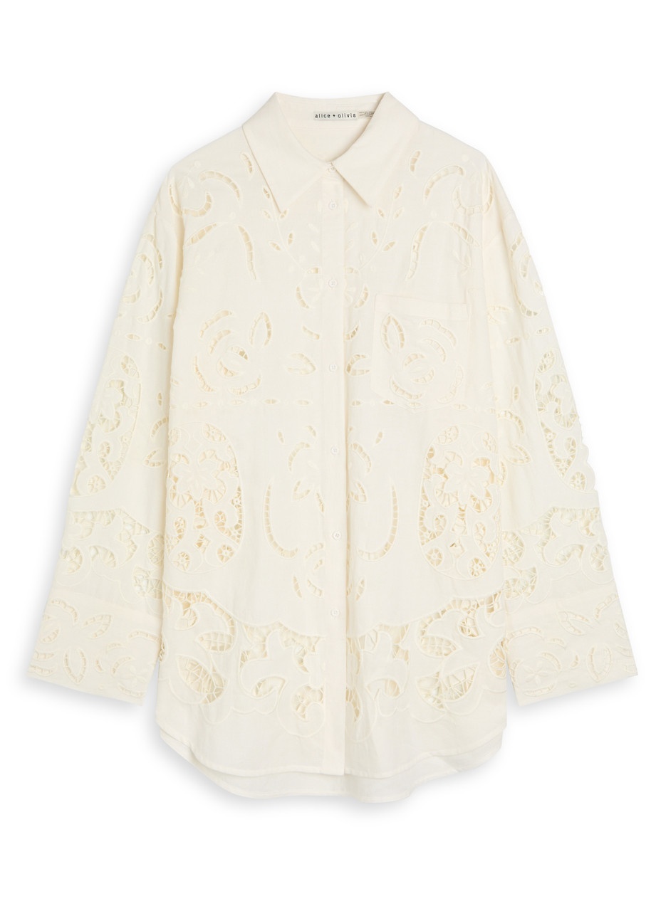 Info & Care Alice + Olivia cotton-blend shirt Open-embroidery, dropped shoulders, button-fastening cuffs, chest patch pocket, curved hem, partially lined; Button fastenings through front; 60% cotton, 40% linen Dry clean Size & Fit Length shoulder to hem: 31 inches/ 78.5cm Midweight Oversized fit Model is 5'9"/ 175cm and wears a size small