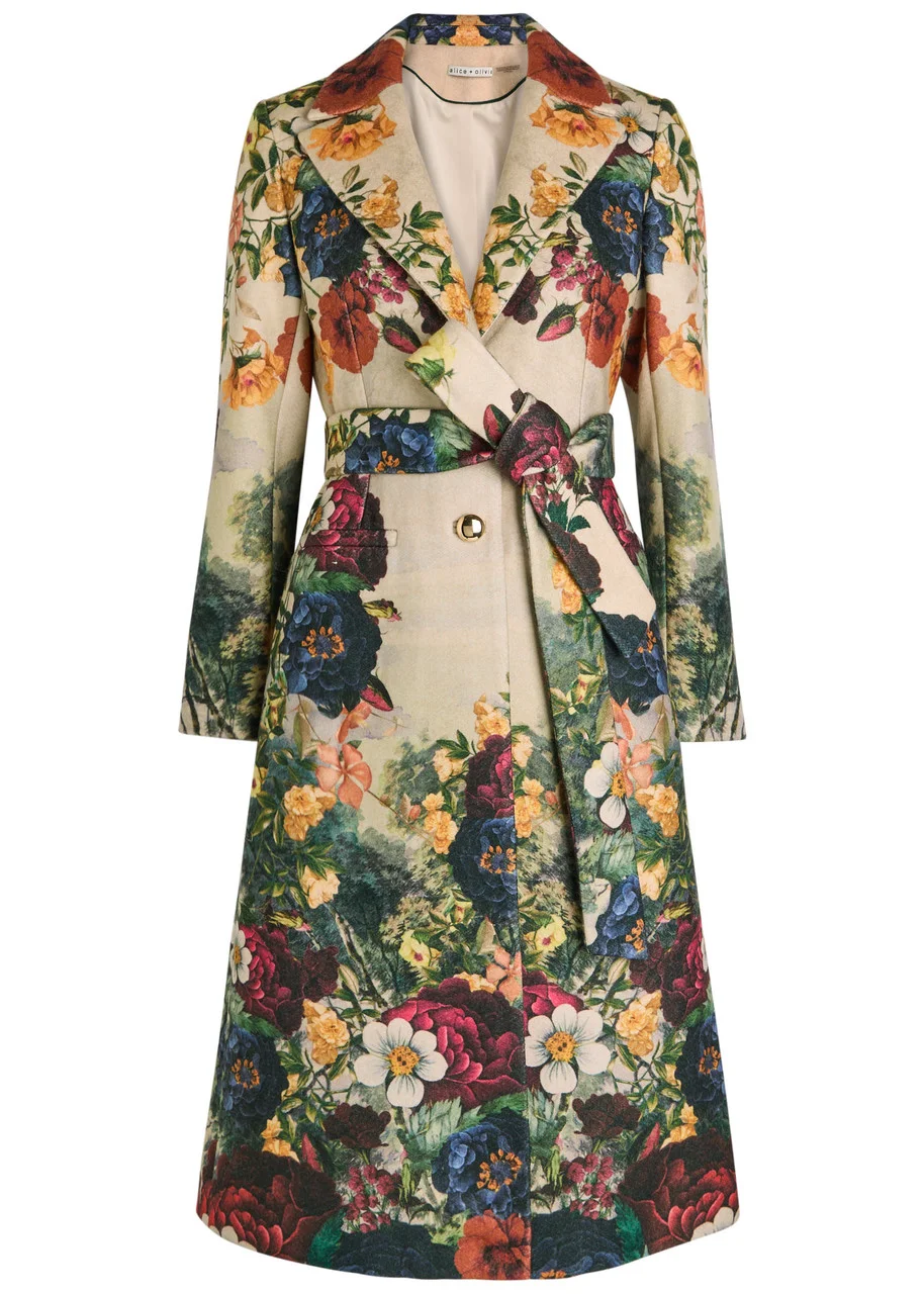 Info & Care alice + olivia coat Floral print, notched lapels, padded shoulders, button-fastenings cuffs, belt loops, detachable waist tie, darts through waist, front slit pockets, back vent, internal button-fastening pocket, fully lined Button fastenings at front; 100% polyester Dry clean Size & Fit Length shoulder to hem: 43 inches/ 109cm Midweight Regular fit, use tie to cinch waist Tailored style, straight cut Model is 5'10"/ 178cm and wears a size;small