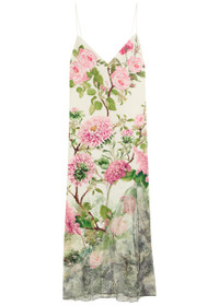 Info & Care Alice + Olivia;satin dress Floral print, V-neck, darts at bust and back waist, side split, floral lace panel at hem, partially lined Concealed zip and hook fastening at side;; Fabric 1: 97% viscose, 3% elastane; fabric 2: 100% nylon; lining: 95%;recycled polyester, 5% elastane Dry clean Size & Fit Length shoulder to hem: 51 inches/ 129.5cm Midweight Close fit, loose skirt Model is 5'10"/ 178cm and wears a size;US4