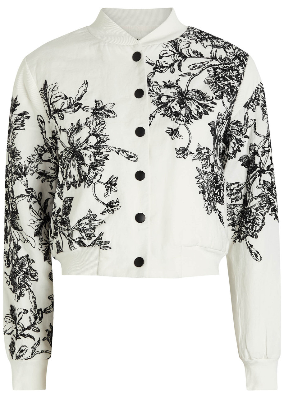 Info & Care Alice + Olivia cotton-blend jacket Floral embroidery, stand collar, side slip pockets, ribbed trims, fully lined; Press-stud fastenings through front 60% cotton, 40% linen Dry clean Size & Fit Length shoulder to hem: 19 inches/ 48cm Midweight Cropped fit Model is 5'10"/ 178cm and wears a size;small