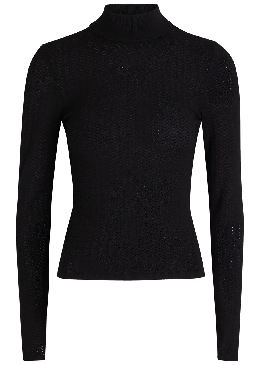 Info & Care alice + olivia semi-sheer knit top Chevron pointelle, turtle-neck, ribbed trims Slips on 60% viscose, 37% polyester, 3% nylon Dry clean Size & Fit Length shoulder to hem: 21 inches/ 53.5cm Midweight Slim fit Model is 5'10"/ 178cm and wears a size small