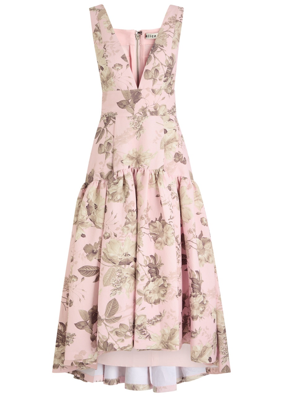 Info & Care Alice + Olivia linen-blend dress Floral print, panelled, low V-neck, pleated, two concealed side slip pockets, concealed structured hem at skirt, longer back hem, fully lined Partially concealed hook and zip fastening at back 56% linen, 43% viscose, 1% elastane Dry clean Size & Fit Length shoulder to hem: 48 inches/ 122cm; back: 52 inches/ 132cm Midweight Fit-and-flare style; Model is 5'10"/ 178cm and wears a size US4