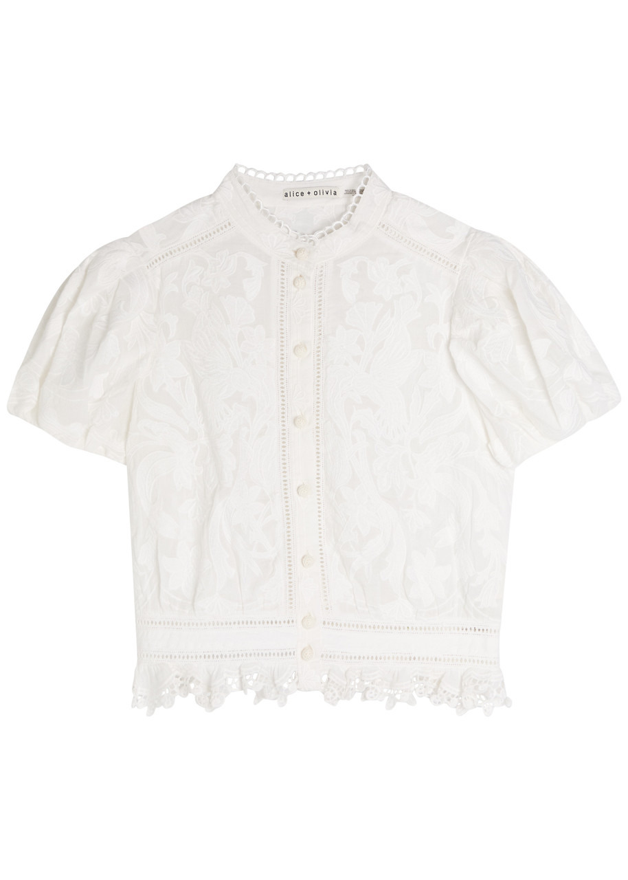 Info & Care alice + olivia cotton blouse Floral embroidery,;stand collar, puff sleeves, elasticated cuffs, lace inserts and trims, pleated details, flared hem, scalloped trims Embroidered button fastenings through front 100%;cotton Dry clean Size & Fit Length shoulder to hem: 19 inches/ 48.5cm Midweight Regular fit, slightly fitted at waist Model is 5'9"/ 175cm and wears a size small
