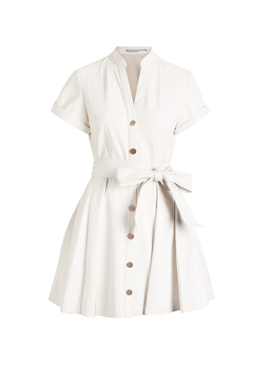 Info & Care Alice + Olivia faux-leather shirt dress V-neck with stand collar, turn-up cuffs, belt loops, tie-fastening belt, side slip pockets Button fastenings through front 100% polyurethane; lining: 95% recycled polyester, 5% elastane Specialist dry clean; Size & Fit Length shoulder to hem: 34 inches/ 86cm Midweight Fitted at the bust and waist Flared skirt Model is 5'10"/ 178cm and wears a size;US4