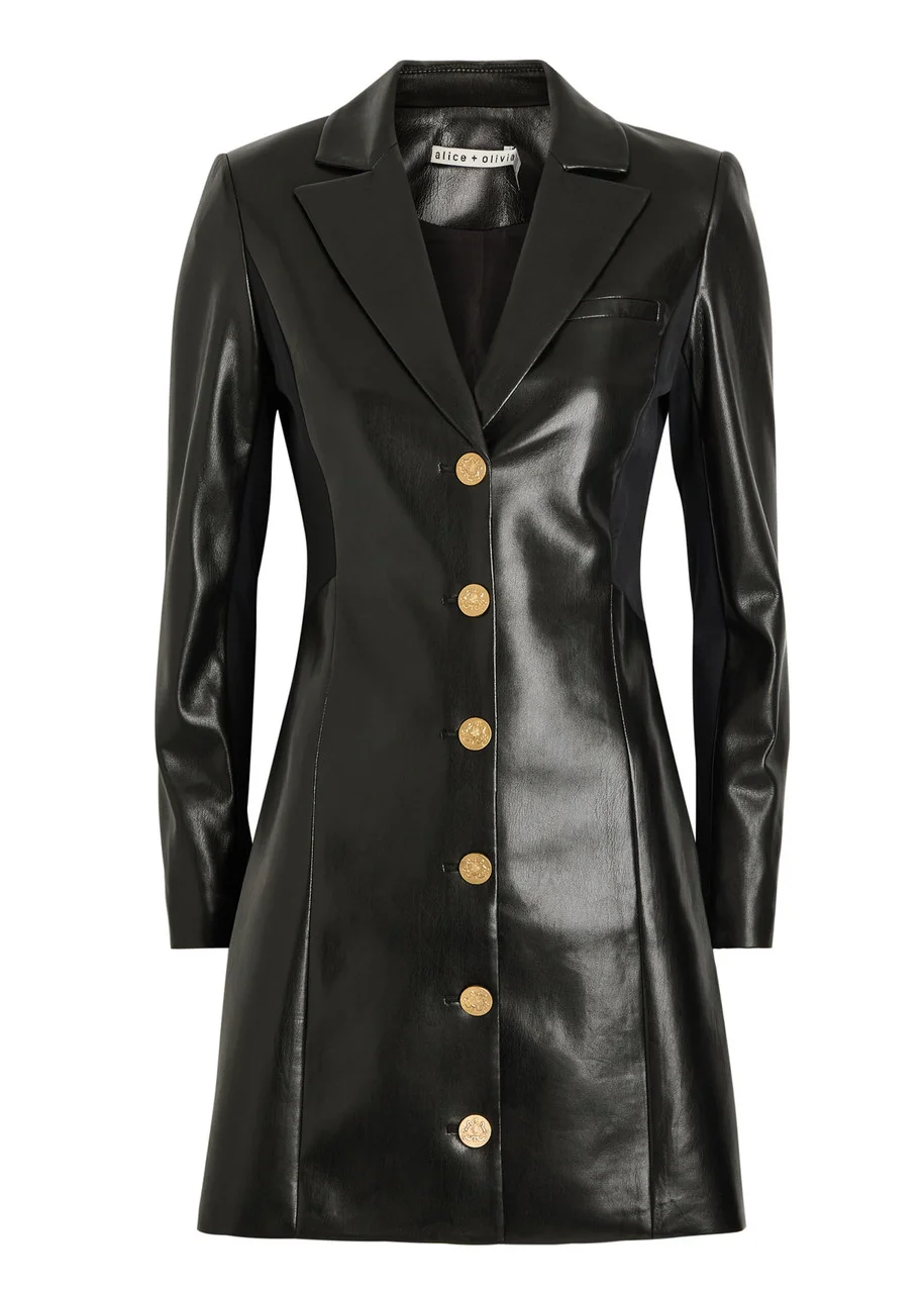 Info & Care alice + olivia faux leather blazer dress Notched lapels, padded shoulders, button-fastening cuffs, faux chest slit pocket, jersey side panels, fully lined Button fastenings through front; 100% polyurethane; lining: 95% recycled polyester, 5% elastane Dry clean Size & Fit Length shoulder to hem: 33 inches/ 84cm Midweight Slim fit, fitted at the waist A-line cut Model is 5'10"/ 178cm and wears a size;US4