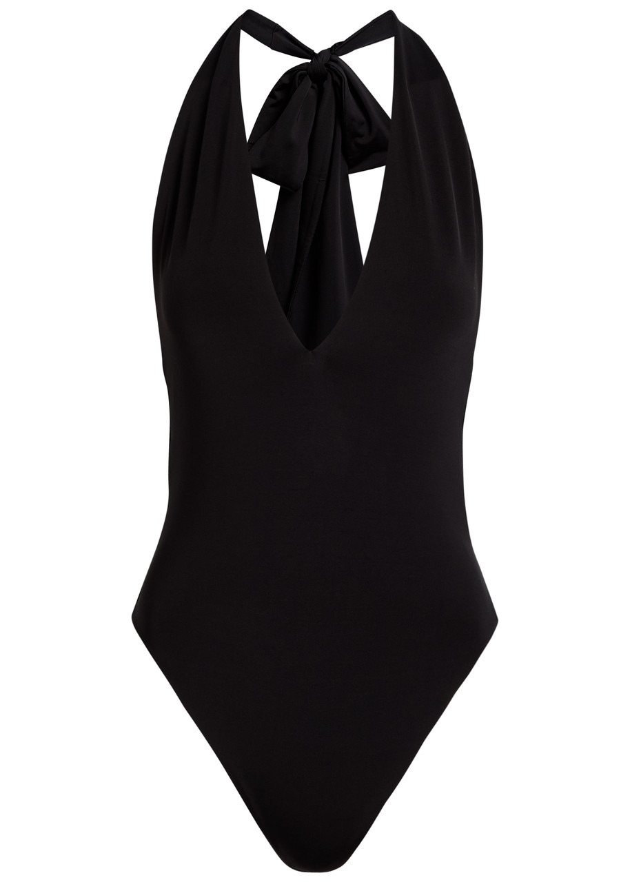 Info & Care Alice and Olivia stretch-jersey bodysuit; Plunge V-neck with halterneck straps Concealed press-stud fastenings at base 90% viscose, 10% elastane Dry clean Size & Fit Length shoulder to hem: 25 inches/ 63.5cm Midweight Slim fit Model is 5'9"/ 175cm and wears a size;small