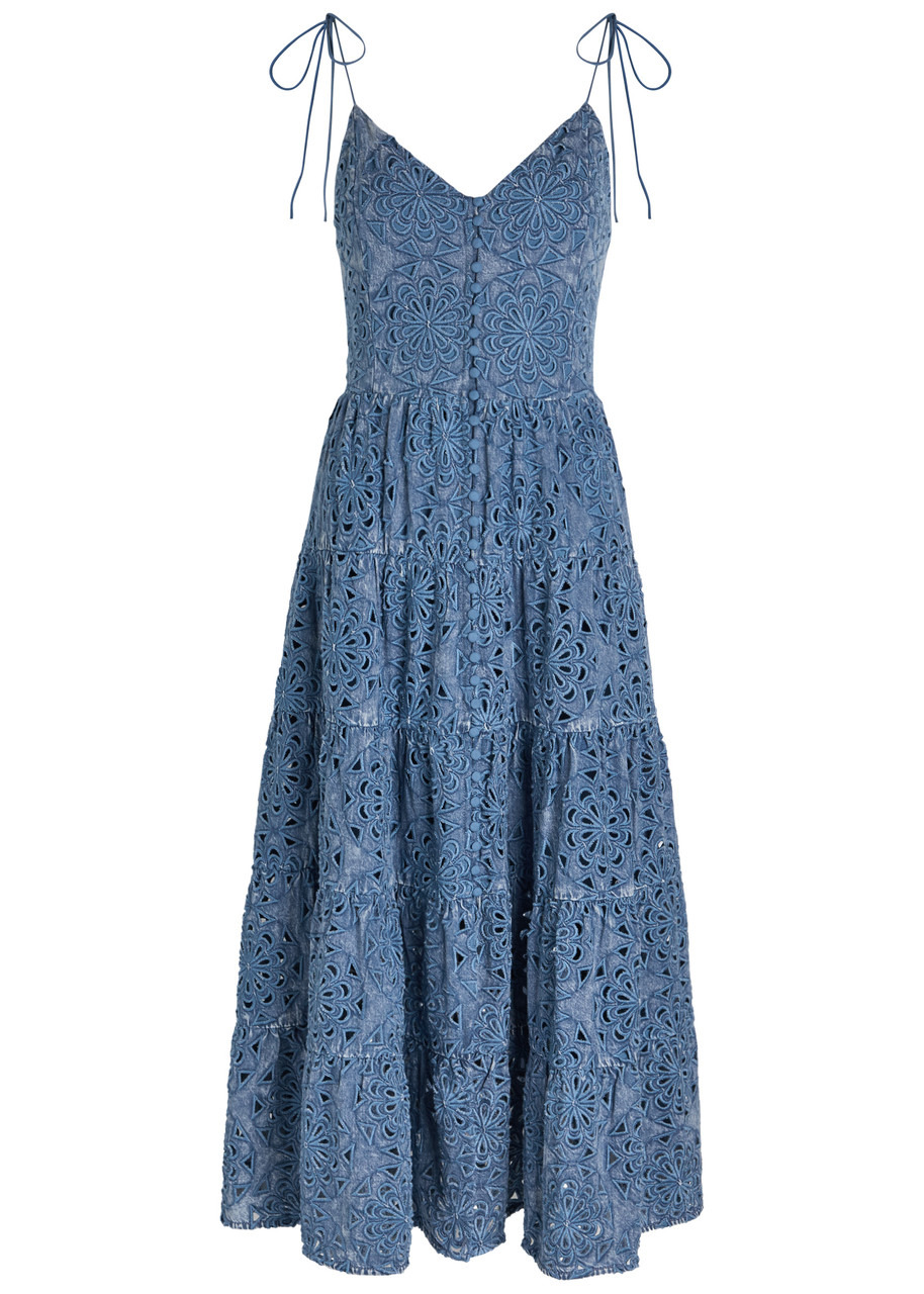 Info & Care alice + olivia chambray dress Cut-work embroidery, adjustable tie-fastening shoulder straps, button-fastening V-neck, darts through bodice, shirred back panel, tiered, faded finish,;partially lined Partially concealed hook and zip fastening at back 100% cotton; lining: 100% polyester Dry clean Size & Fit Length shoulder to hem: 49 inches/ 124.5cm Midweight Fit-and-flare style Model is 5'10"/ 178cm and wears a size US4