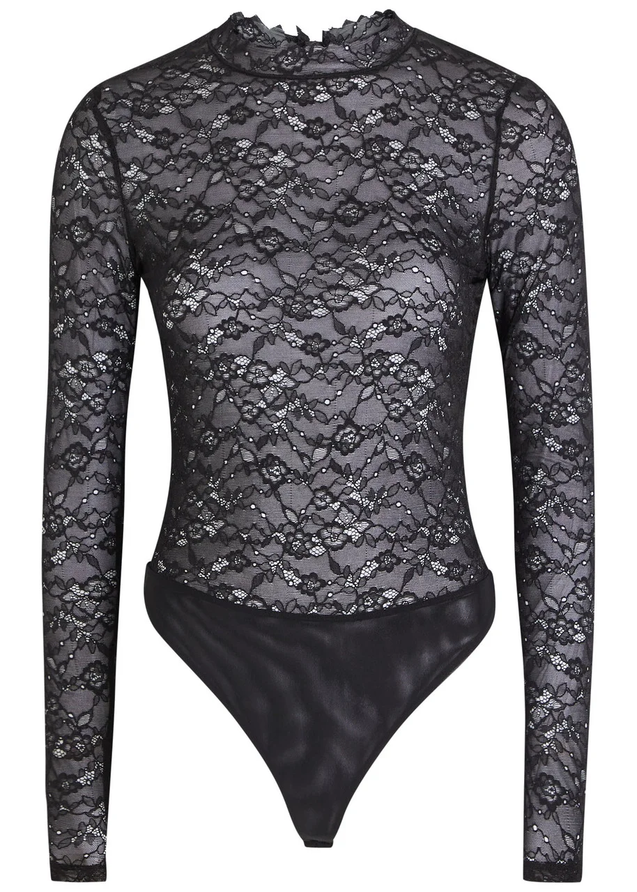 Info & Care alice + olivia sheer lace bodysuit Floral lacework, scallop-trimmed mock-neck Concealed zip fastening through back and press-stud fastenings at base 88% nylon, 12% elastane Dry clean Size & Fit Length shoulder to base: 26 inches/ 66cm Midweight Slim fit Model is 5'10"/ 178cm and wears a size small
