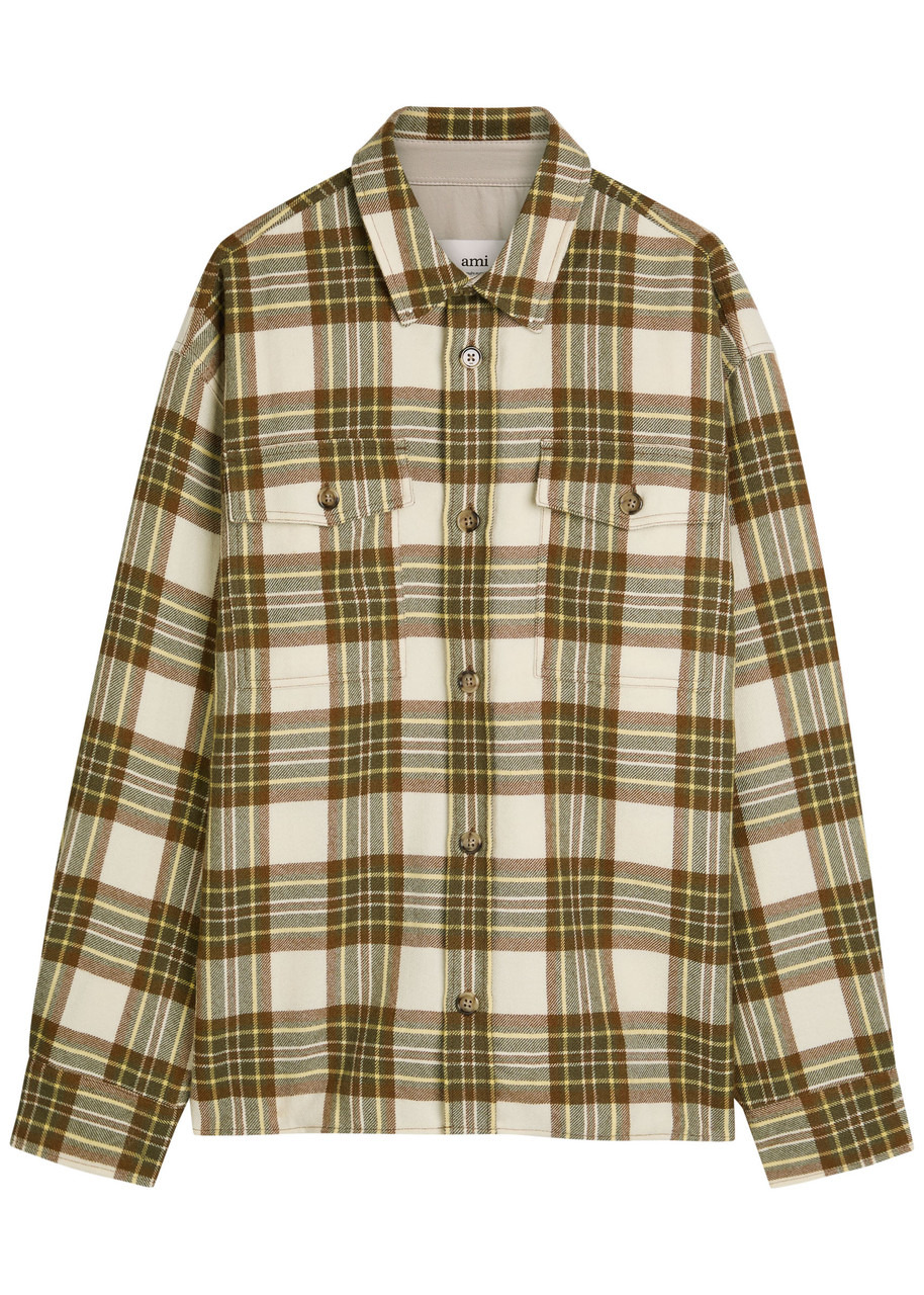 Info & Care AMI Paris wool overshirt Checked, button-fastening cuffs, two button-fastening flap pockets, side splits at hem Button fastenings through front 100% virgin wool Dry clean Size & Fit Length shoulder to hem: 28 inches/ 71cm Midweight Relaxed fit Model is 6'1"/ 185cm, chest size 38.5 inches and wears a size medium