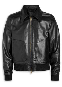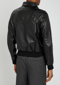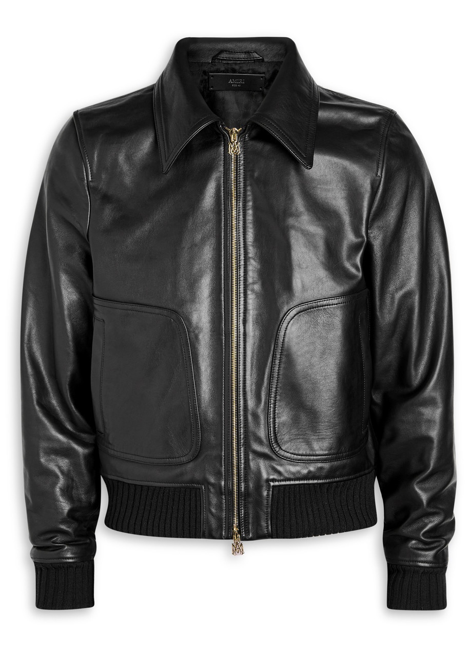 Info & Care Amiri leather jacket Designer-appliqued back, two front patch pockets, sculpted designer plaques at zip-pulls, ribbed-knit trims, internal press-stud fastening slip pocket, fully lined Two-way zip fastening through front 100% leather; lining: 100% viscose Spot clean Size & Fit Length shoulder to hem: 23 inches/ 58.5cm Midweight Boxy style, regular fit Model is 6'2"/ 188cm, chest size 38 inches and wears a size;IT48