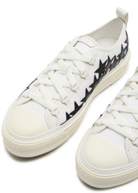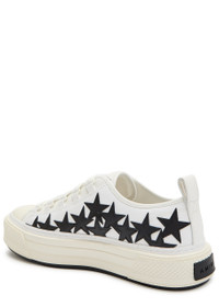 Info & Care Amiri leather sneakers Designer-debossed tab at tongue, canvas side panels, contrasting leather star appliques at sides, heel tab, rubberised toe panel, designer plaques at textured rubber midsole, rubber sole, round toe Lace-up front Size & Fit Only available in full sizes, go up to the nearest whole size if you take a half size;