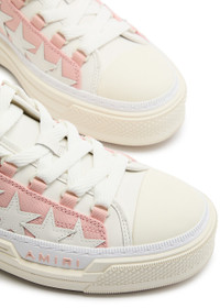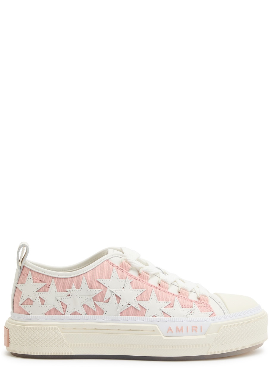 Info & Care Amiri leather sneakers Designer-debossed tab at tongue, contrasting canvas side panels, leather star appliques at sides, heel tab, rubberised toe panel, designer plaques at textured rubber midsole, rubber sole, round toe Lace-up front Size & Fit Only available in full sizes, go up to the nearest whole size if you take a half size;