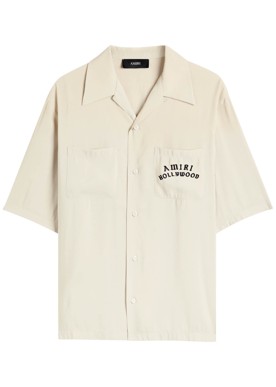 Info & Care Amiri woven shirt Button-fastening camp collar,;designer embroidery at front and back, chest patch pockets, brushed finish Button fastenings through front 87% modal, 13% polyester Dry clean Size & Fit Length shoulder to hem: 27 inches/ 68.5cm Midweight Relaxed, boxy fit Model is 6'1"/ 185cm, chest size 38.5 inches and wears a size medium