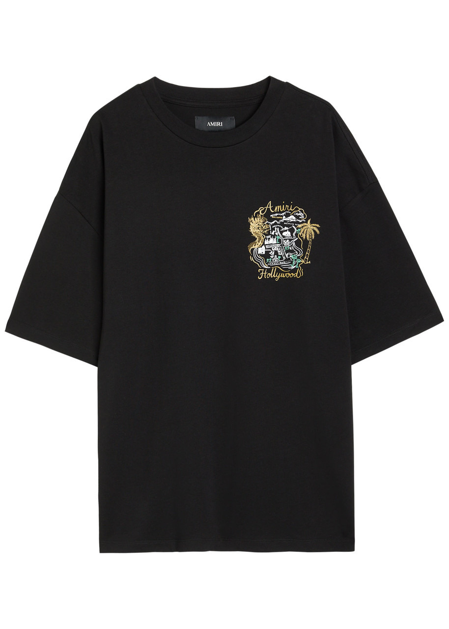 Info & Care Amiri cotton T-shirt Glittered designer print at chest and back, ribbed crew-neck, dropped shoulders Slips on 100% cotton Dry clean Size & Fit Length shoulder to hem: 29 inches/ 73.5cm Midweight Relaxed fit, oversized style Model is 6'0"/ 183cm, chest size 38 inches and wears a size medium