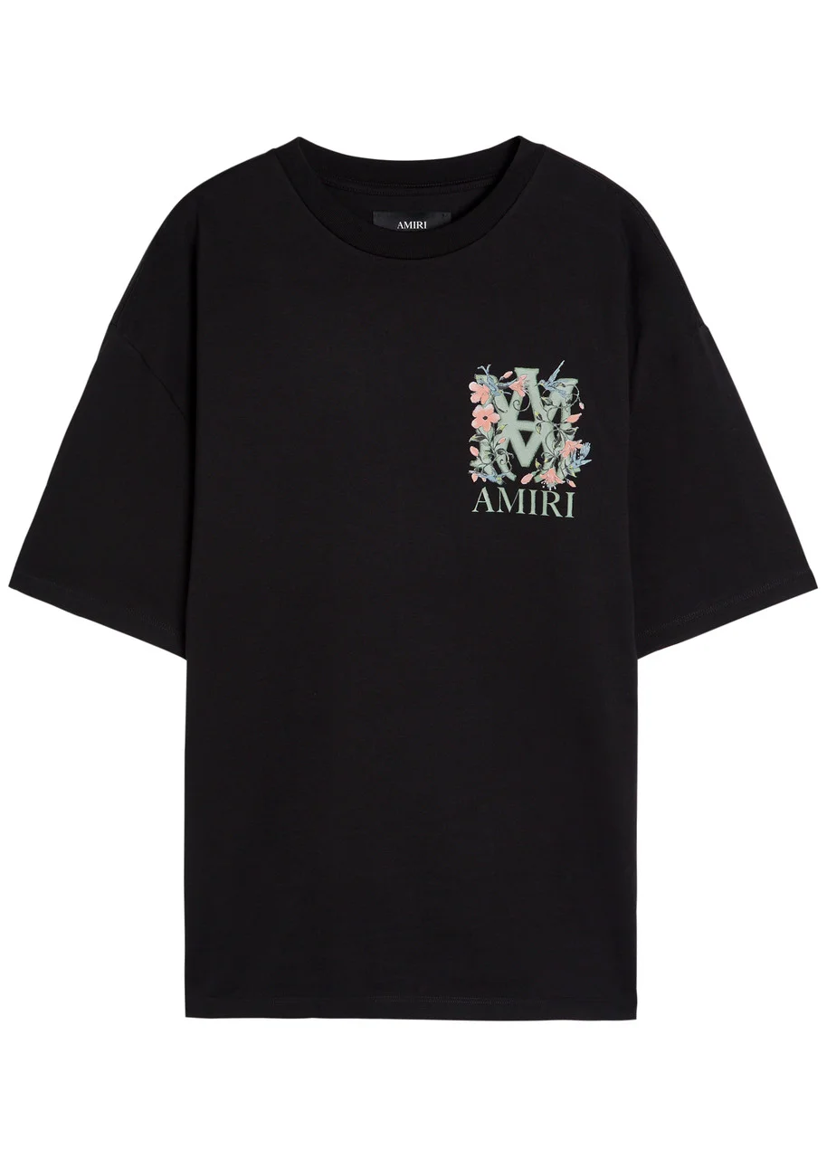 Info & Care Amiri cotton T-shirt; Monogram logo and floral print at chest and back, ribbed crew-neck Slips on 100% cotton; Hand wash Size & Fit Length shoulder to hem: 28 inches/ 71cm Heavyweight Relaxed fit Model is 6'1"/ 185cm, chest size 36 inches and wears a size medium