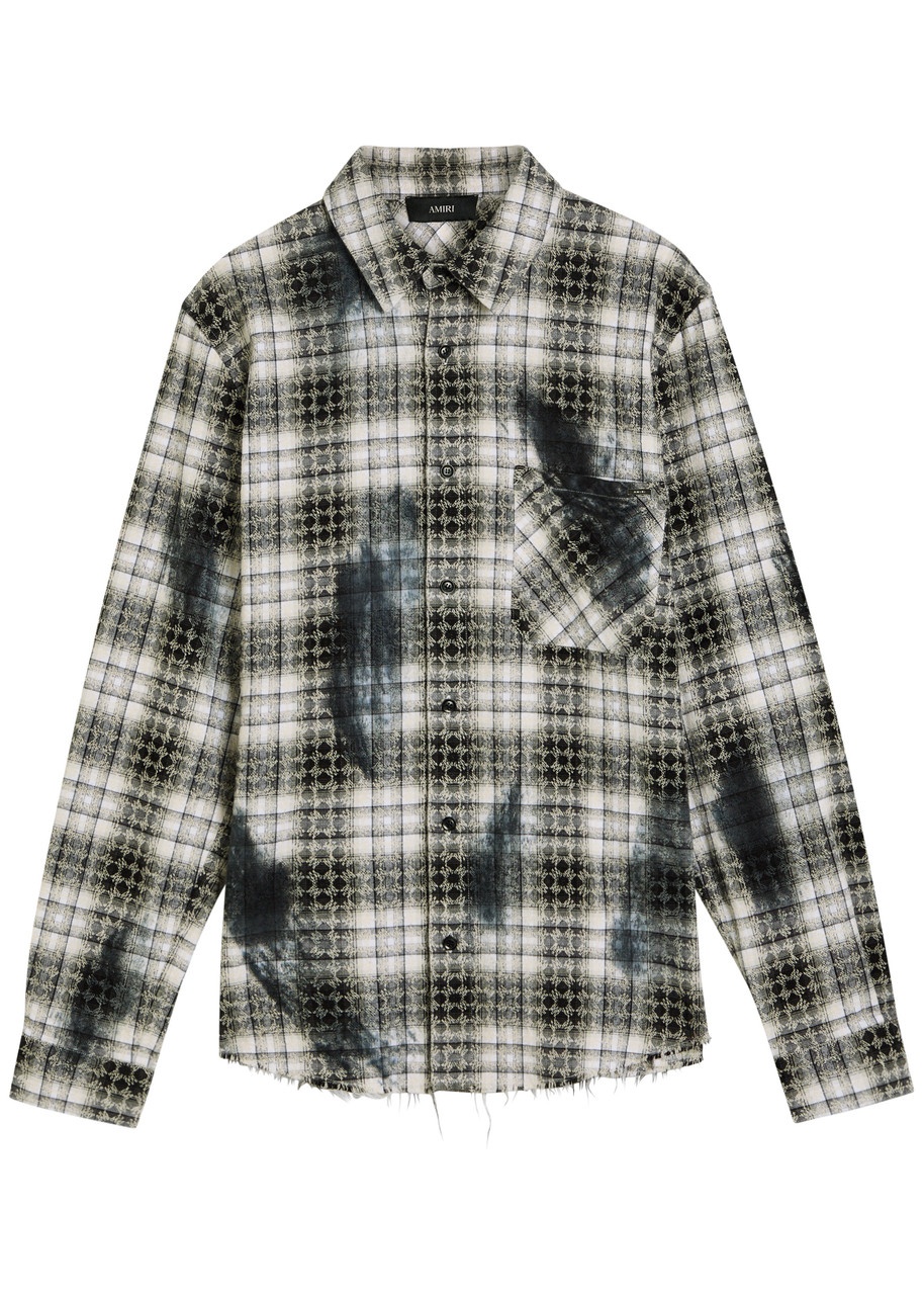 Info & Care Amiri cotton flannel shirt Checked, jacquard, button-fastening cuffs, designer plaque at chest patch pocket, designer print at back, raw-trimmed curved hem, bleached and distressed details Button fastenings through front 100%;cotton; Dry clean Size & Fit Length shoulder to hem: 28 inches/ 68.5cm Midweight Relaxed, boxy fit Model is 6'1"/ 185cm, chest size 36 inches and wears a size medium
