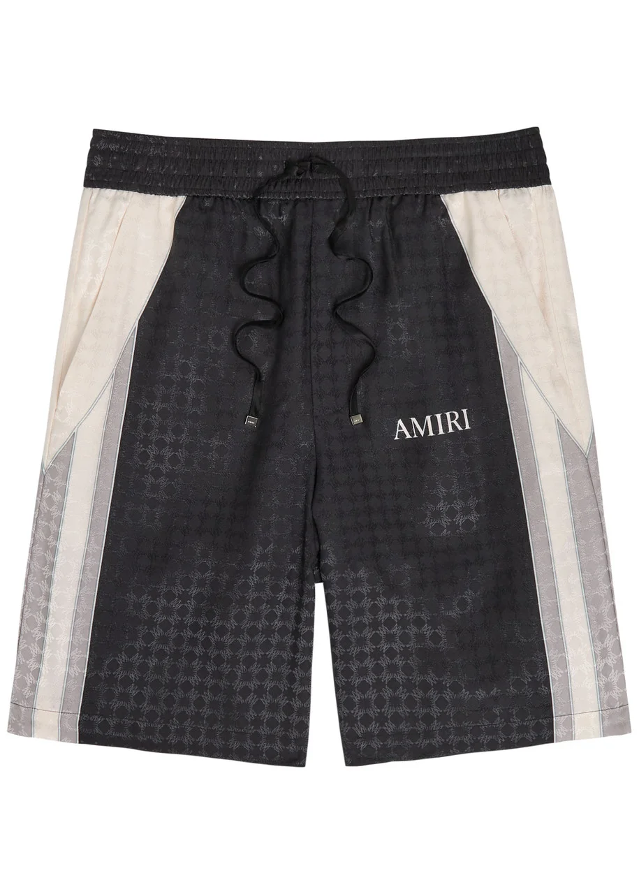 Info & Care Amiri satin shorts Logo monogram jacquard, colour blocked, elasticated drawstring waistband, side slip pockets, logo print Pull on 100%;viscose Dry clean Size & Fit Length waist to hem: 20 inches/ 51cm Midweight Relaxed fit Model is 6'1"/ 185cm and wears a size medium