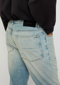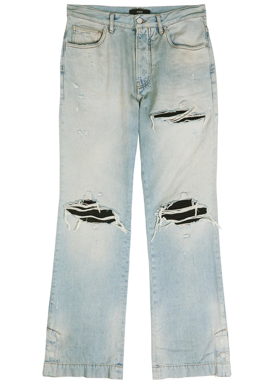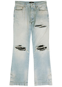 Info & Care Amiri denim jeans; Mid-rise fit, flared straight-leg cut, belt loops, five pockets, rips at front with ribbed denim inserts, press-stud fastening cuffs, designer plaques at back, whiskered, faded and distressed finish Partially concealed button fastening through front; 100% cotton; Dry clean; Size & Fit Front rise: 12 inches/ 31cm Inside leg length: 33 inches/ 84cm Midweight Model is 6'2"/ 188cm and wears a size;W32