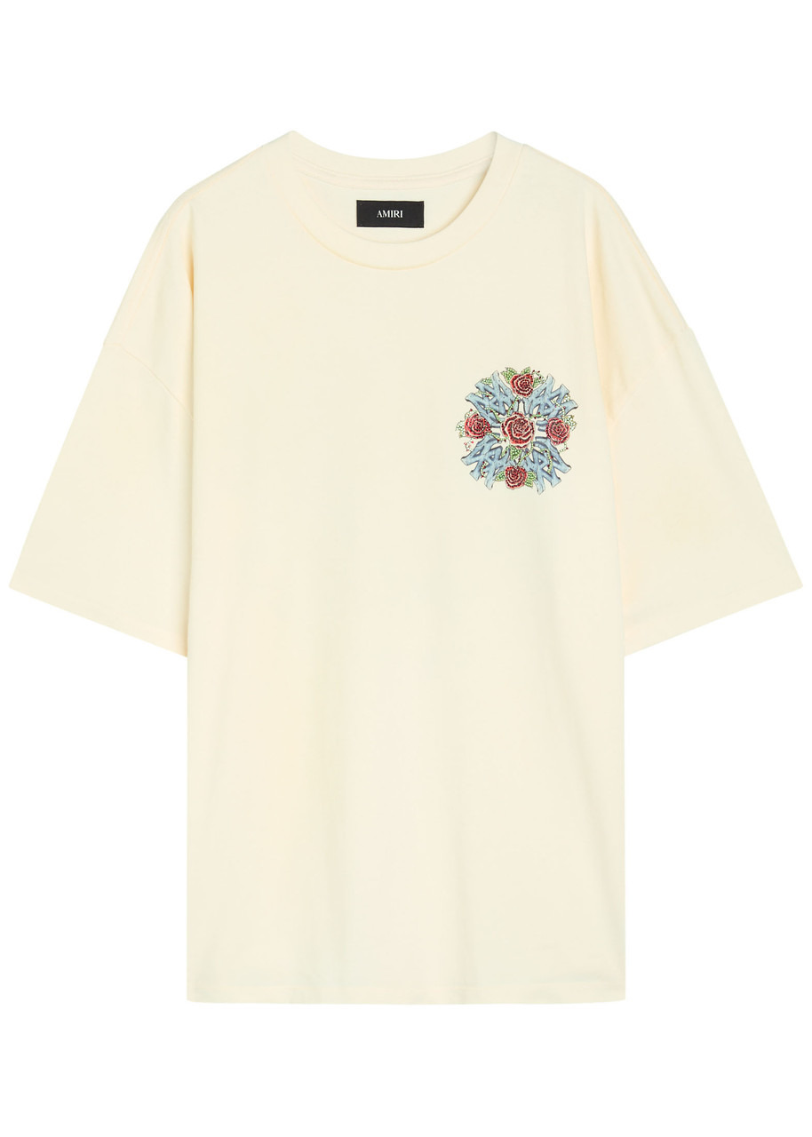 Info & Care Amiri cotton T-shirt Designer print at chest and back, ribbed crew-neck, dropped shoulders, crystal embellishments Slips on 100% cotton Dry clean Size & Fit Length shoulder to hem: 29 inches/ 73.5cm Midweight Relaxed fit, oversized style Model is 6'0"/ 183cm, chest size 38 inches and wears a size medium