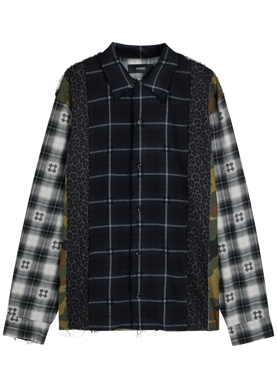 Info & Care Amiri cotton shirt Patchwork with checked, leopard print and camouflage panels, dropped shoulders, plaid sleeves with logo-monogrammed print, button-fastening cuffs, raw-edged trims Button fastenings through front 100% cotton Dry clean Size & Fit Length shoulder to hem: 29 inches/ 73.5cm Midweight Relaxed fit Model is 6'2"/ 188cm, chest size 38 inches and wears a size medium