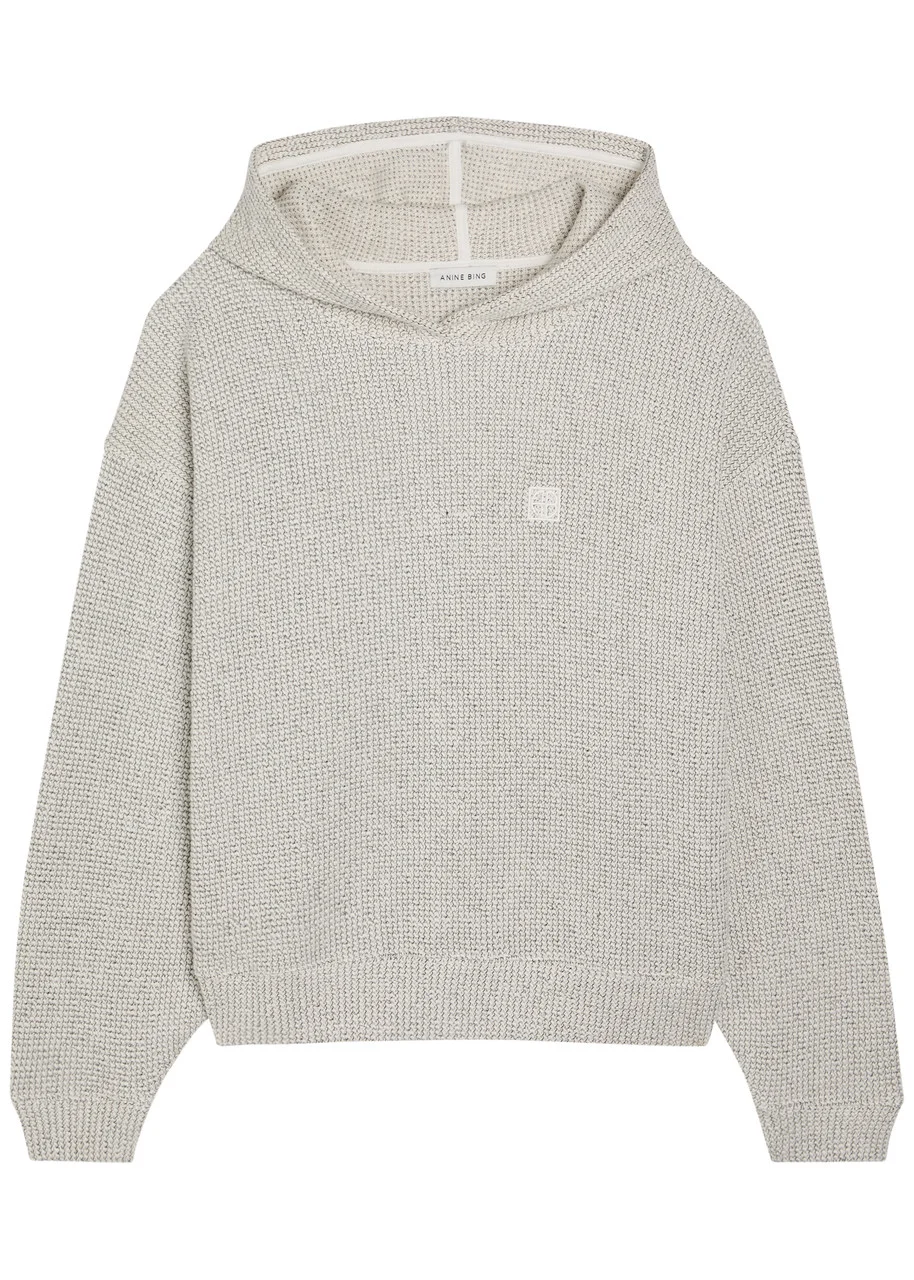 Info & Care Anine Bing cotton-blend jumper Marled terry knit, hood, dropped shoulders, logo embroidery, ribbed trims Slips on 92% cotton, 8% polyester Machine wash Coordinating items available; Size & Fit Length shoulder to hem: 25 inches/ 63.5cm Midweight Relaxed fit Model is 5'9"/ 175cm and wears a size small