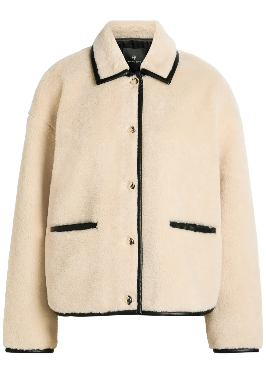 Info & Care Anine Bing teddy jacket Dropped shoulders, front slip pockets, faux leather trims, curved hem, fully lined Button fastenings through front 87% polyester, 8% acrylic, 5% wool; lining: 55% polyester, 45% viscose Dry clean Size & Fit Length shoulder to hem: 23 inches/ 58.5cm Midweight Boxy fit Model is 5'9"/ 175cm and wears a size small