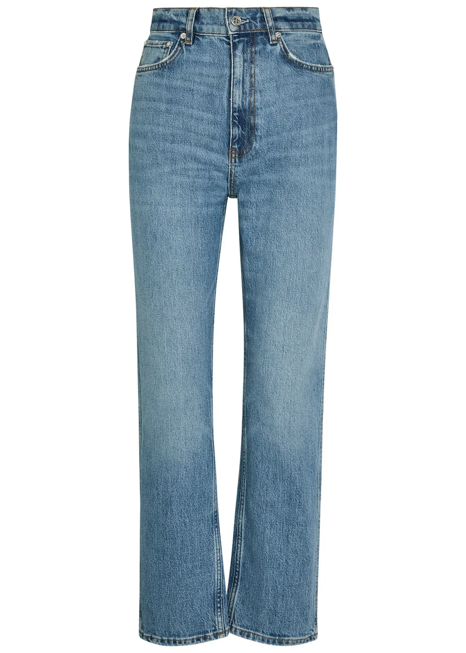 Info & Care Anine Bing denim jeans; High-rise fit, slim-leg cut, belt loops, five pockets, designer plaque at back, slightly distressed trims, whiskered and faded finish Partially concealed button fastenings at front; 100% cotton Machine wash cold inside out to avoid colour transfer Size & Fit Front rise: 12 inches/ 30.5cm Inside leg length: 27 inches/ 68.5cm Midweight Model is 5'9"/ 175cm and wears a size;W27
