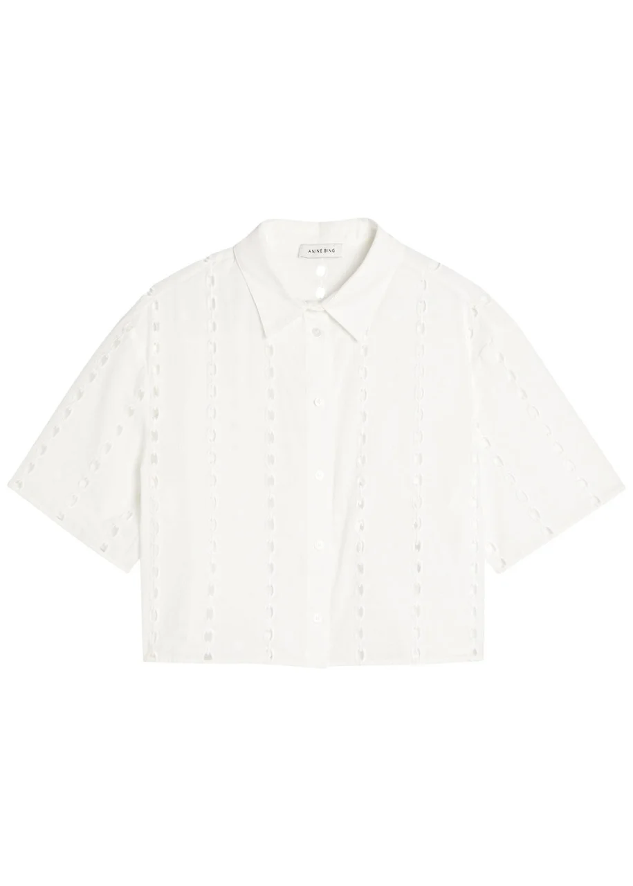 Info & Care Anine Bing cotton shirt Cutwork and logo embroidery,;box pleat at back, side splits Button fastenings through front 100% cotton Machine wash Size & Fit Length shoulder to hem: 19 inches/ 48.5cm Midweight Boxy fit Model is 5'9"/ 175cm and wears a size small