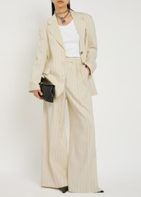 Info & Care Anine Bing woven trousers Pinstriped, belt loops, pleats at waist, side slip pockets, pressed crease through legs, faux slit pocket at back, fully lined Concealed button, hook and zip fastening at front 91% viscose, 8% polyester, 1% elastane; lining: 100% polyester Dry clean; Coordinating item available; Size & Fit Inside leg length: 31 inches/ 78.5cm Midweight Wide-leg cut, designed to sit high on the waist; Model is 5'10"/ 178cm and wears a size;US6
