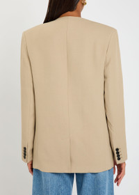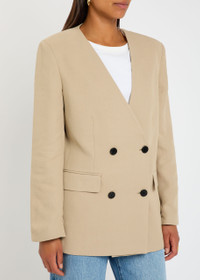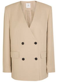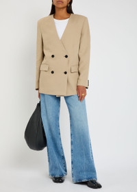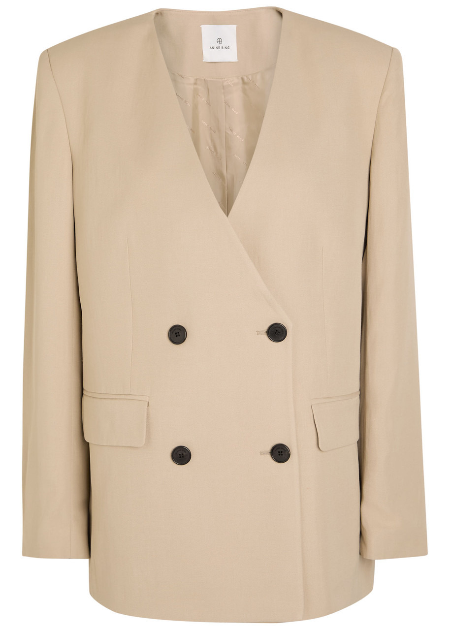 Info & Care Anine Bing woven;blazer Low V-neck,;padded shoulders, faux button-fastening cuffs, front flap pockets, darts through waist,;back vent, two internal slit pockets,;fully lined Double-breasted button fastenings at front; 60% viscose, 22% lyocell, 18% linen; lining: 52% viscose, 48% polyester Dry clean Size & Fit Length shoulder to hem: 27 inches/ 68.5cm Midweight Designed to be worn oversized Model is 5'8"/ 173cm and wears a size small;