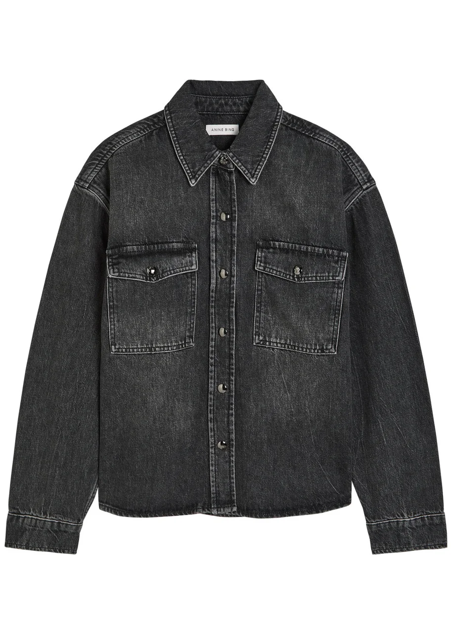 Info & Care Anine Bing denim shirt Press-stud fastening cuffs, press-stud fastening chest flap pockets, box pleat at back, curved hem, washed finish Press-stud fastenings through front 100% cotton Machine wash inside out to avoid colour transfer Size & Fit Length shoulder to hem: 24 inches/ 61cm Midweight Relaxed fit, boxy style Model is 5'9"/ 175cm and wears a size small
