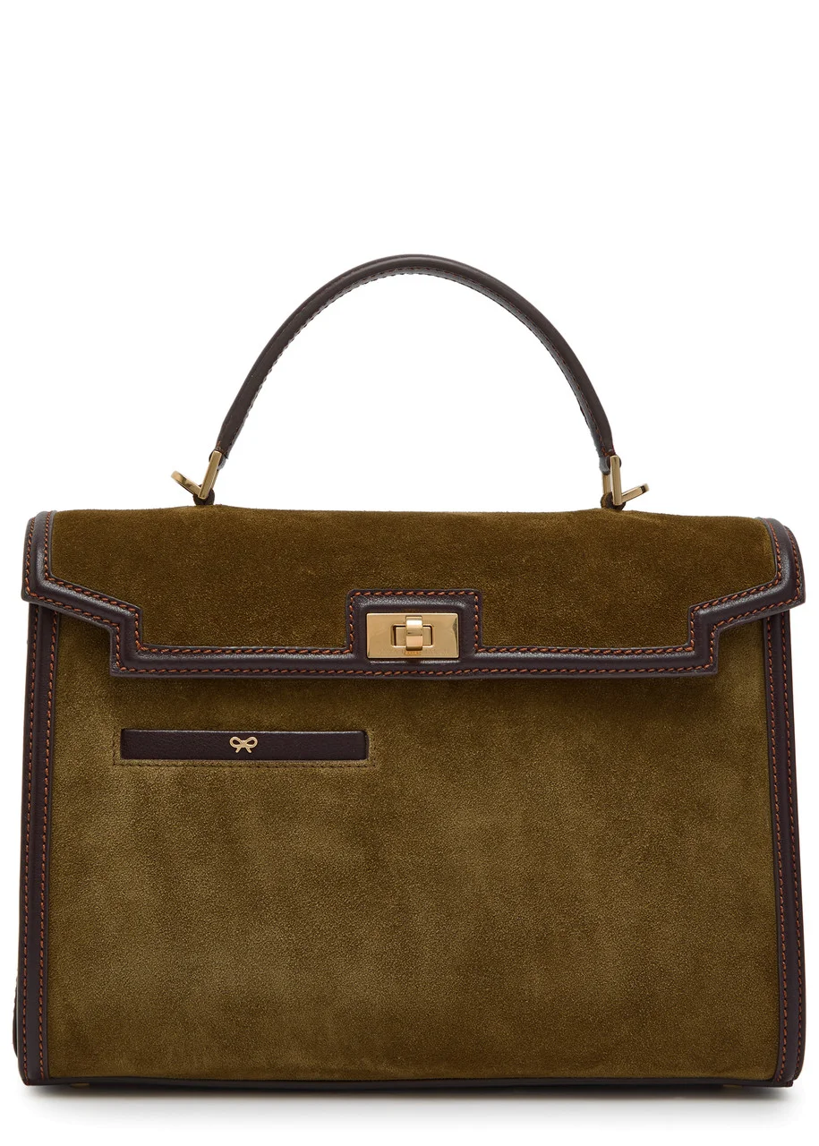 Info & Care Anya Hindmarch suede top handle bag Leather top handle, detachable adjustable leather shoulder strap, front slit pocket with logo embellishment, metal D-ring at side, adjustable magnetic-fastening sides, metallic designer stamp at back, feet, leather trims, designer-engraved hardware, contrast stitching, three internal patch pockets, internal card slot, internal zip-fastening pocket, fully lined Turn-lock fastening at flap front Size & Fit Width: 10 inches/ 25.5cm Height: 7 inches/ 18cm Width: 3.5 inches/ 9cm Top handle drop: 3.5 inches/ 9cm Min. shoulder strap drop: 19 inches/ 48.5cm Max. shoulder strap drop: 23 inches/ 58.5cm