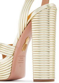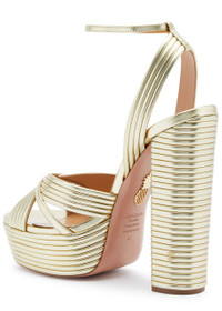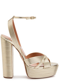 INFO & CARE - Aquazzura metallic leather sandals - Heel measures approximately 5.5 inches/ 140mm with a 1.5 inch/ 40mm platform - Ribbed, cross-over front straps, open round toe - Adjustable buckle-fastening ankle strap SIZE & FIT - Only available in full sizes go up to the nearest whole size if you take a half size