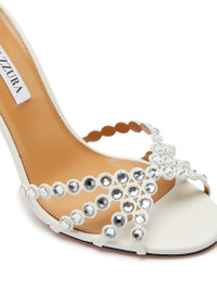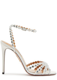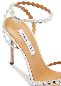 INFO & CARE - Aquazzura leather sandals - Heel measures approximately 4 inches/ 105mm - Crystal embellishments, open round toe - Buckle-fastening ankle strap SIZE & FIT - Only available in full sizes, go up to the nearest whole size if you take a half size