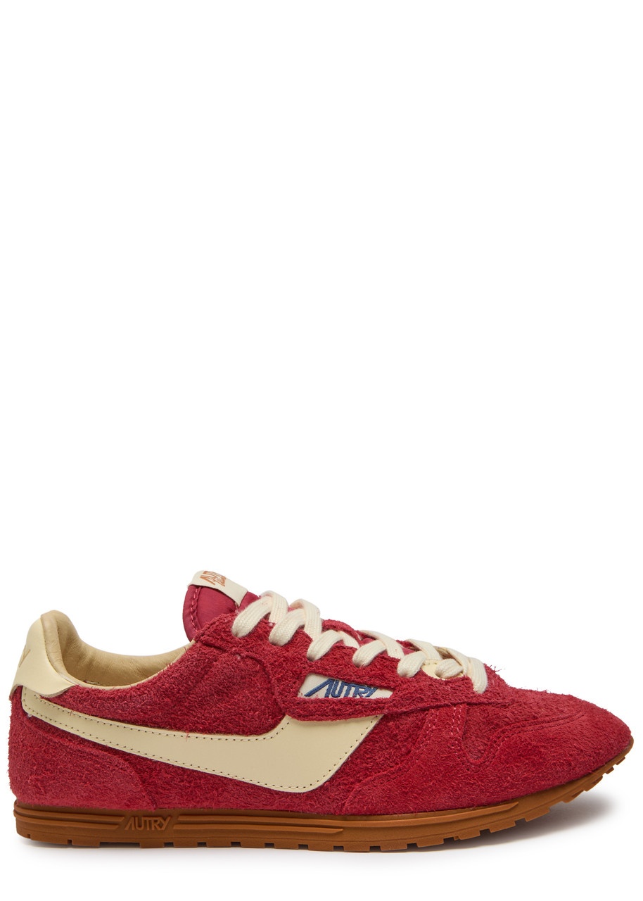 Info & Care Autry brushed suede sneakers Designer plaque at padded nylon tongue and side, panelled, metallic designer-stamped leather heel panel, padded ankle, logo-embossed rubber midsole, gripped rubber sole, round toe Lace-up front Size & Fit Only available in full sizes, go up to the nearest whole size if you take a half size