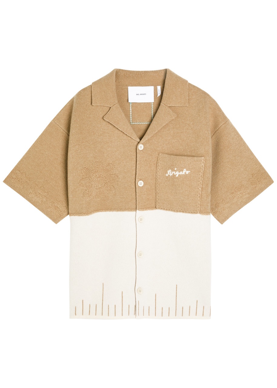 Info & Care Axel Arigato wool shirt; Camp collar, slightly dropped shoulders, floral intarsia design at sleeves and front, designer embroidery at chest patch pocket, designer plaque at back neck, contrast embroidery at hem Button fastenings through front; 100% wool Hand wash; Size & Fit Length shoulder to hem: 27.5 inches/ 70cm Midweight Relaxed fit Model is 6'1"/ 186cm, chest size 38.5 inches and wears a size medium
