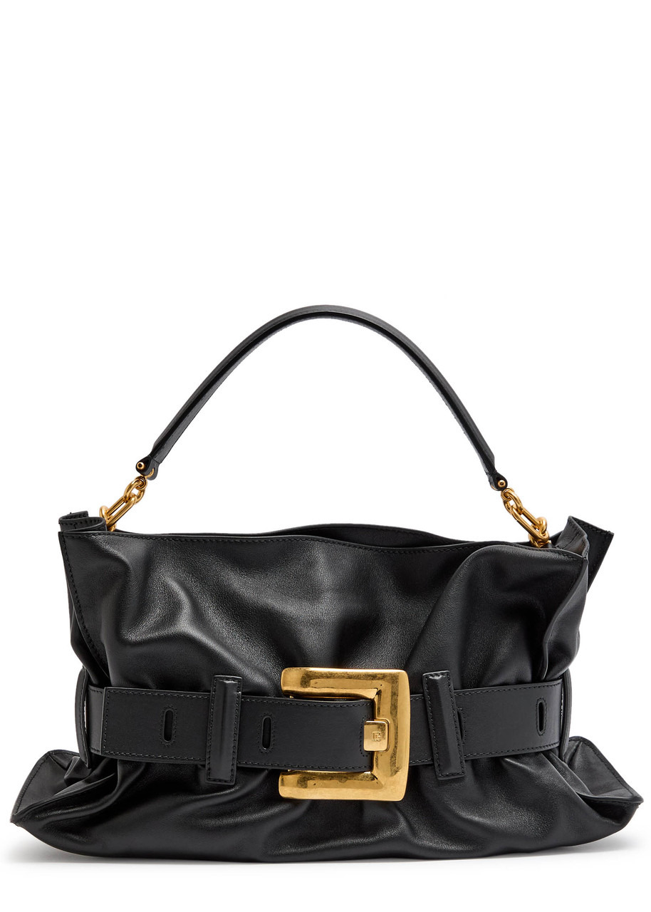 Info & Care Balmain leather shoulder bag Top handle, oversized buckle, designer plaque, internal press-stud fastening pocket, internal card slot, suede lining Concealed magnetic fastenings at top Size & Fit Width: 15 inches/ 38cm Height: 9 inches/ 23cm Depth: 5 inches/ 12.5cm Top handle drop: 6 inches/ 15cm