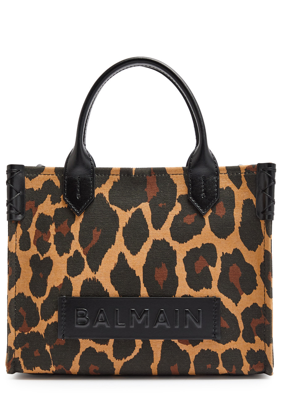 Info & Care Balmain canvas tote Detachable adjustable leather shoulder strap, two leather top handles, leopard print, designer-embossed leather plaque, leather panels and feet, internal slip pocket, fully lined Lobster-clasp fastening at top Size & Fit Width: 10 inches/ 25.5cm Height: 8 inches/ 20cm Depth: 4 inches/ 10cm Top handle drop: 4 inches/ 10cm Min. shoulder strap drop: 20 inches/ 51cm Max. shoulder strap drop: 18 inches/ 46cm