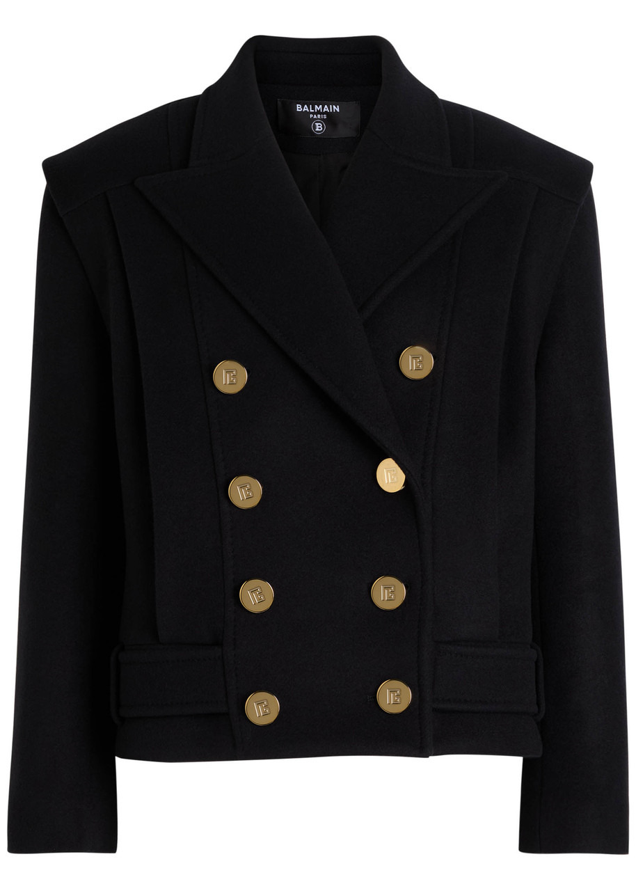 Info & Care Balmain wool-blend coat Peaked lapels, padded shoulders, inverted pleats through front, side slip pockets, belt loops, belt at back hem, designer-engraved hardware, internal button-fastening slit pocket, fully lined Double-breasted button fastenings at front 75% virgin wool, 25% polyamide; lining: 52% viscose, 48% cotton Dry clean Size & Fit Length shoulder to hem: 23 inches/ 58.5cm Midweight Boxy fit Model is 5'9"/ 175cm and wears a size;FR38