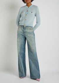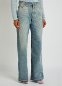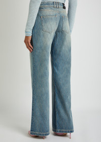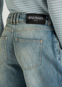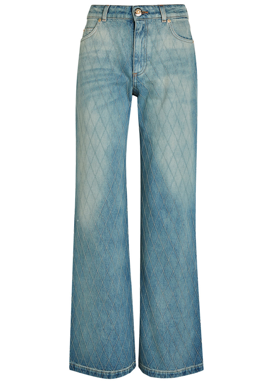 Info & Care Balmain denim jeans; Mid-rise fit, wide-leg cut,;diamond stitching,;belt loops, five pockets, designer plaque at back, whiskered, designer engraved hardware, faded finish; Partially concealed button and zip fastenings at front; 100% cotton; Machine wash inside out to avoid colour transfer Size & Fit Front rise: 9.5 inches/ 24cm Inside leg length:;33 inches/ 84cm Midweight; Model is 5'9"/ 175cm and wears a size FR36
